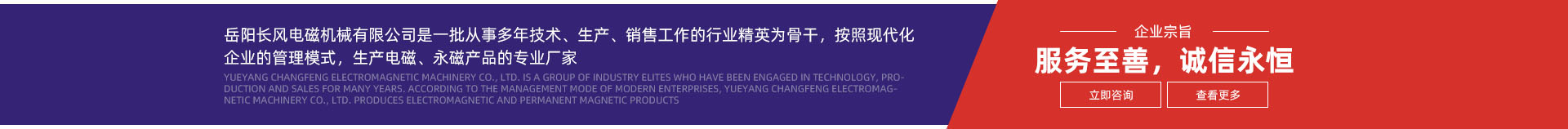 岳陽長風(fēng)電磁機械有限公司是生產(chǎn)電磁、永磁產(chǎn)品的專業(yè)廠家,傳統(tǒng)產(chǎn)品有:起重電磁鐵、電磁(永磁)除鐵器、電纜(氣體軟管、水纜軟管、鋼絲繩)卷筒、整流控制設(shè)備、全免維護停電保磁控制設(shè)備、電磁(永磁)輪、高梯度磁選機、電磁攪拌器等;產(chǎn)品型號規(guī)格齊全,市場遍布冶金、機械、電力、交通、礦山、化工、水泥等行業(yè),產(chǎn)品暢銷國內(nèi)二十多個省市自治區(qū),并遠銷于日本、歐美和東南亞等國家。近幾年來,又成功的開發(fā)和研制了磁力開卷器專用型永久磁鐵(電磁鐵)、吸吊鋼帶卷用的高溫起重電磁鐵等高科技產(chǎn)品,深受各大鋼鐵公司薄板生產(chǎn)廠家的青睞。